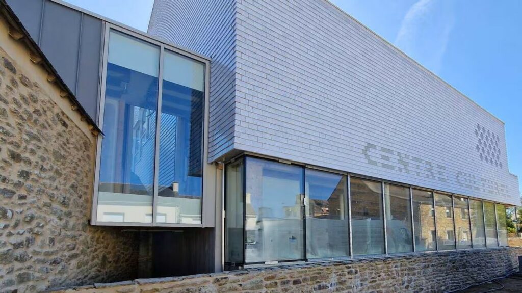 Projet : Centre culturel (Brech), 2025Architectes : Entre-sol Hébergeant la médiathèque municipale au rez-de-chaussée, le nouveau centre culturel de Brech dispose d’une salle à l’étage