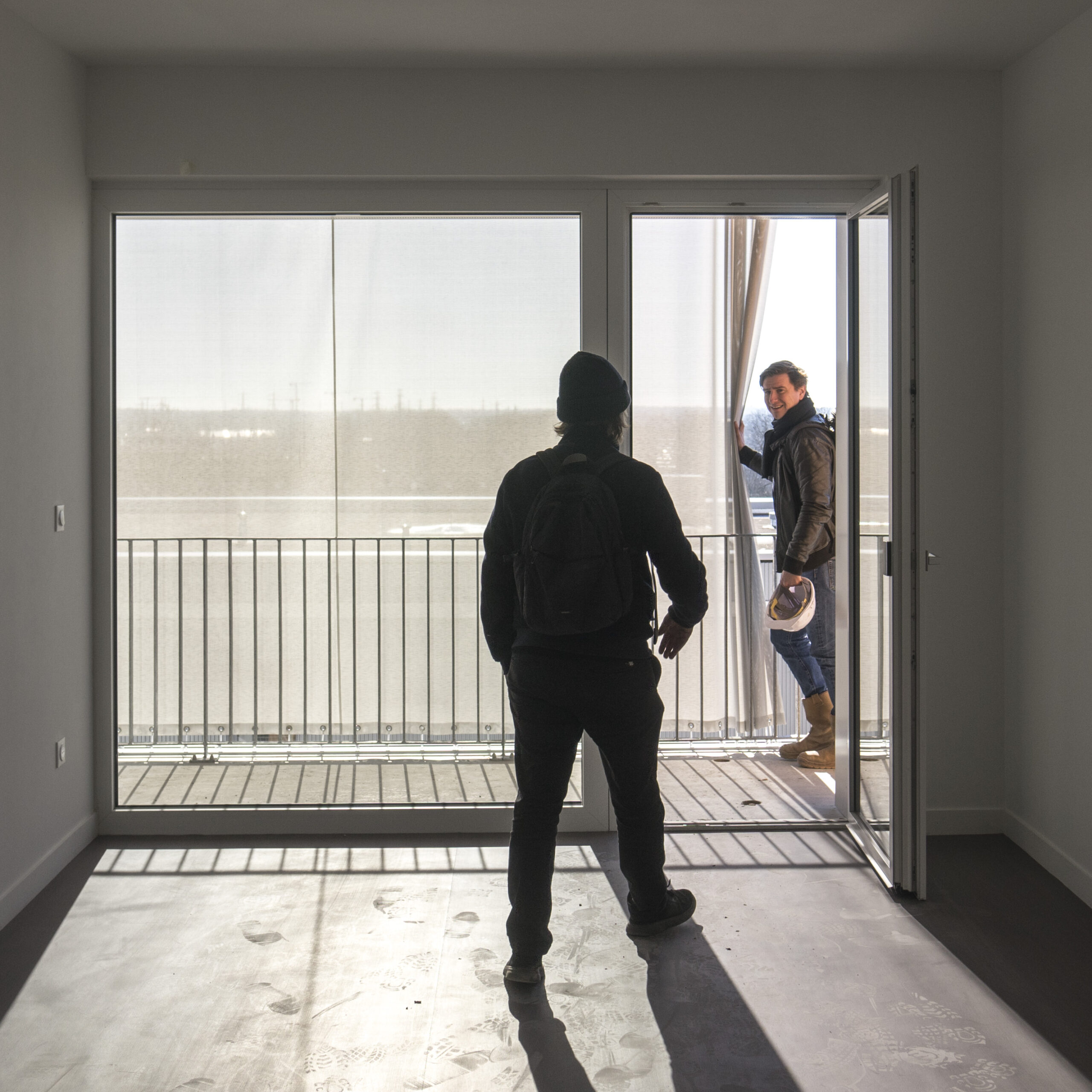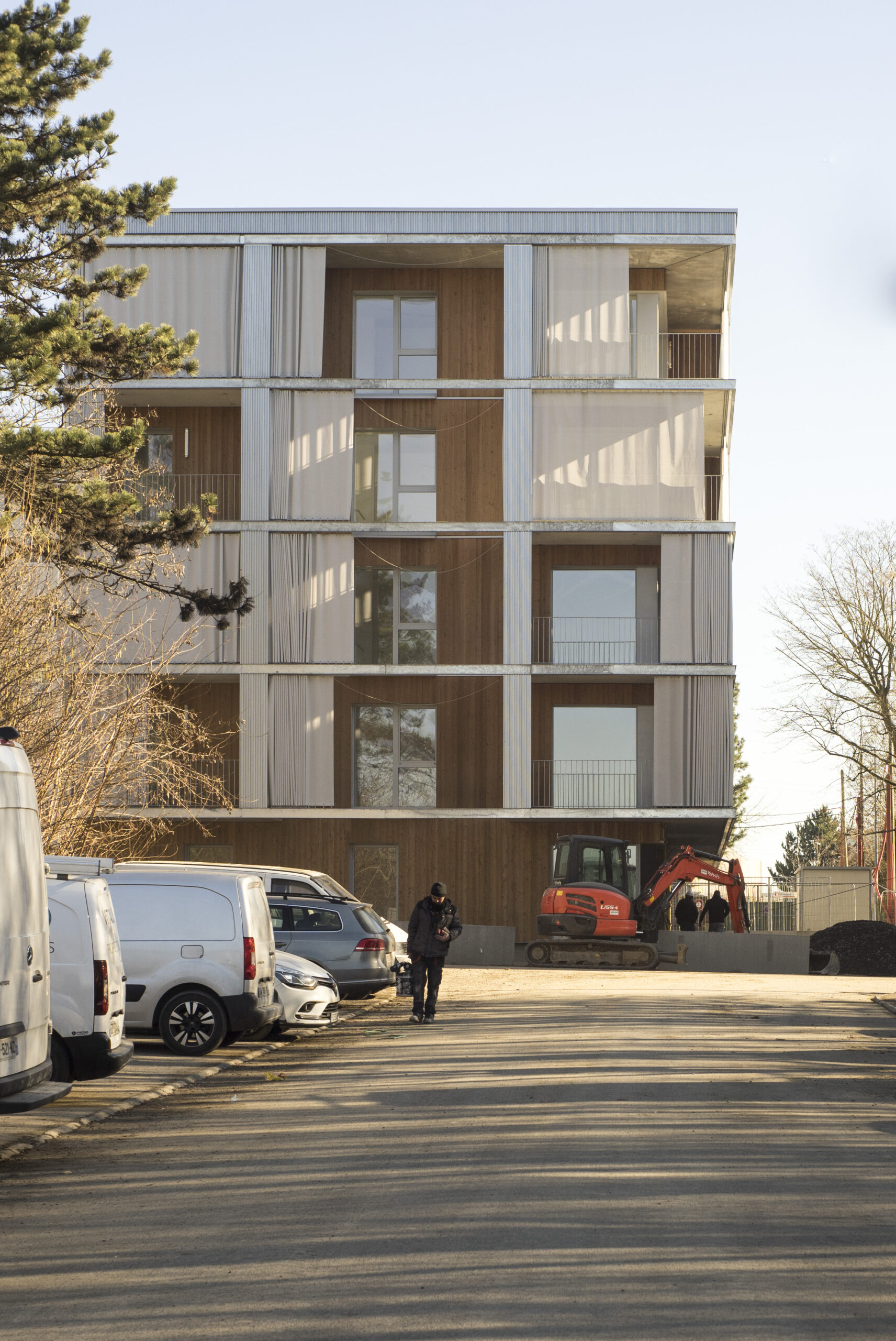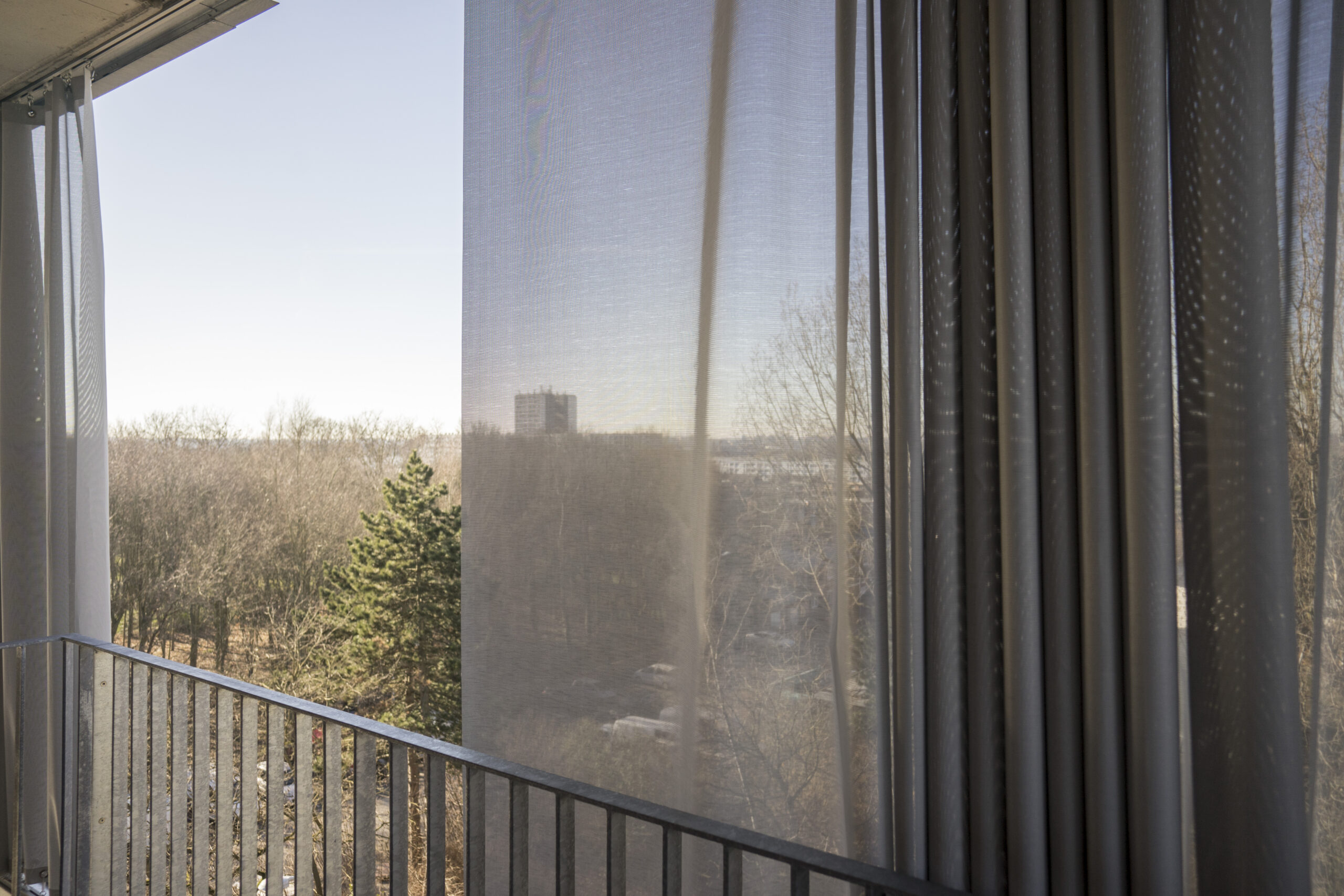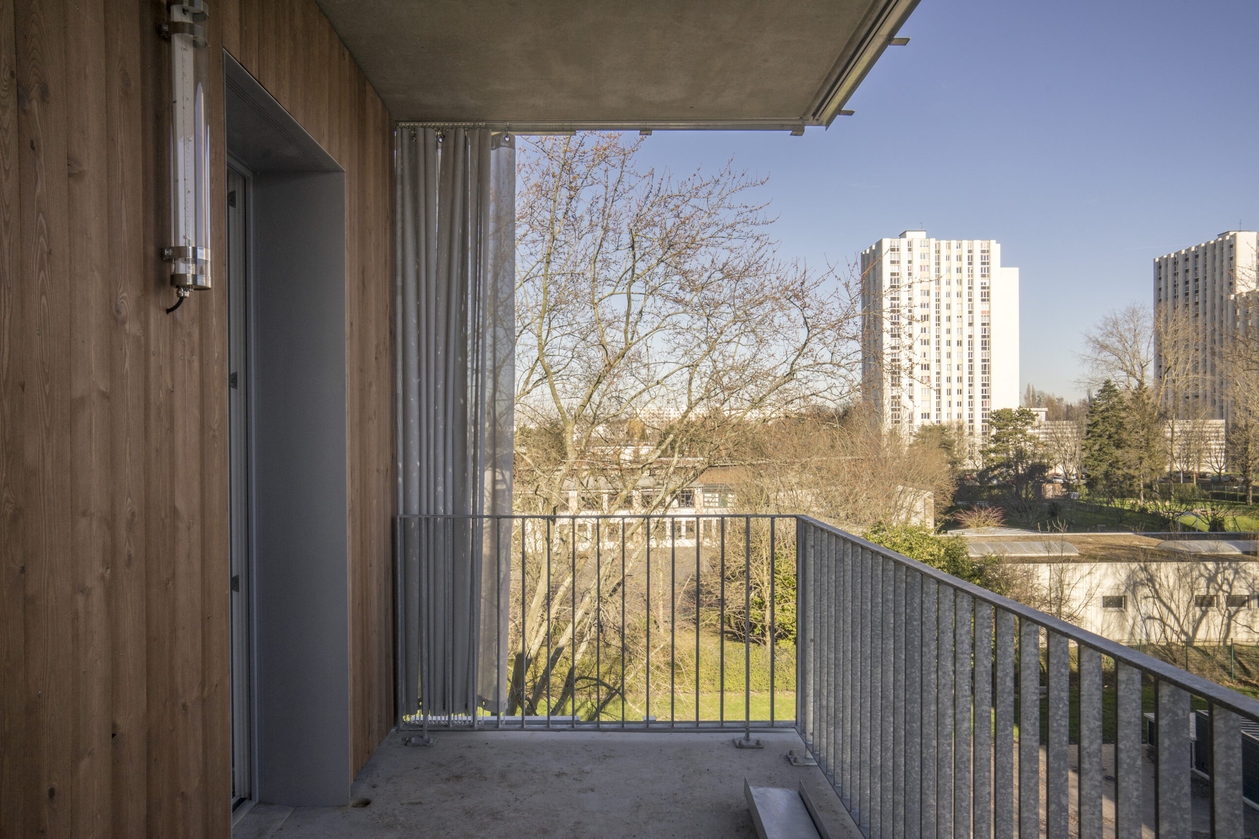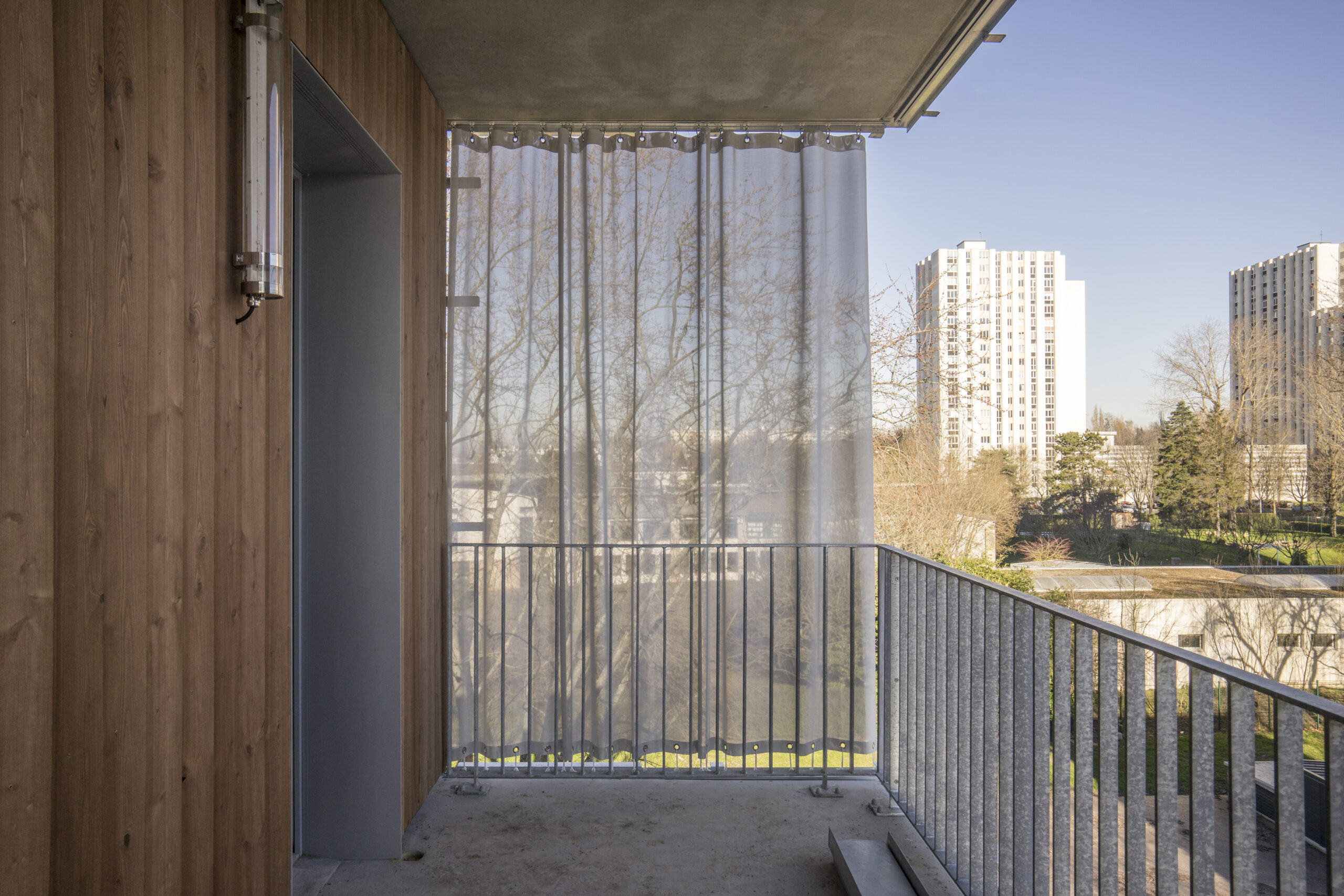 Construction de 43 logements passifs, de larges terrasses équipées de Rideaux Extérieurs en toile ISO Screen II avec rails haut et bas Supertrac alu anodisé.
