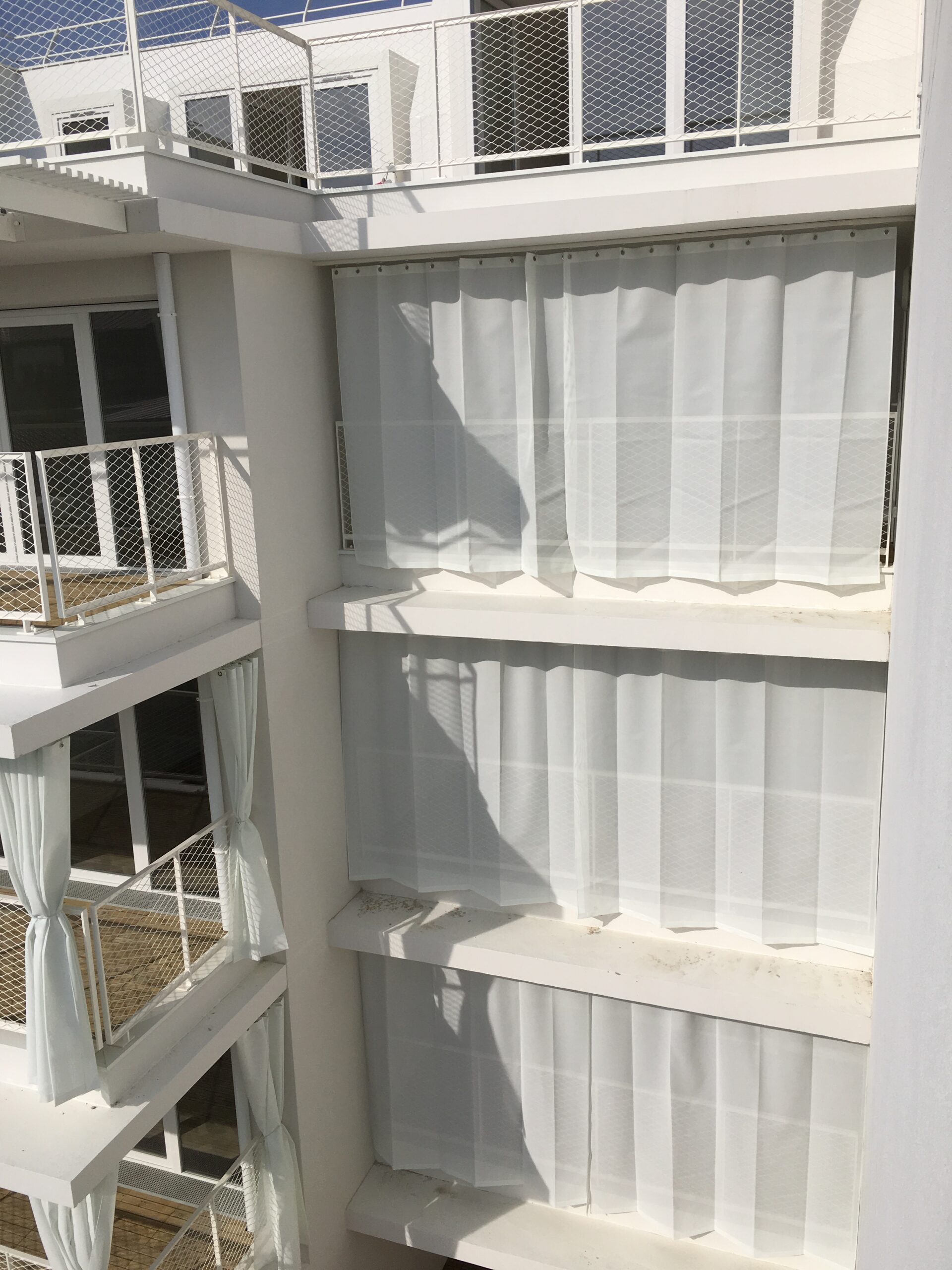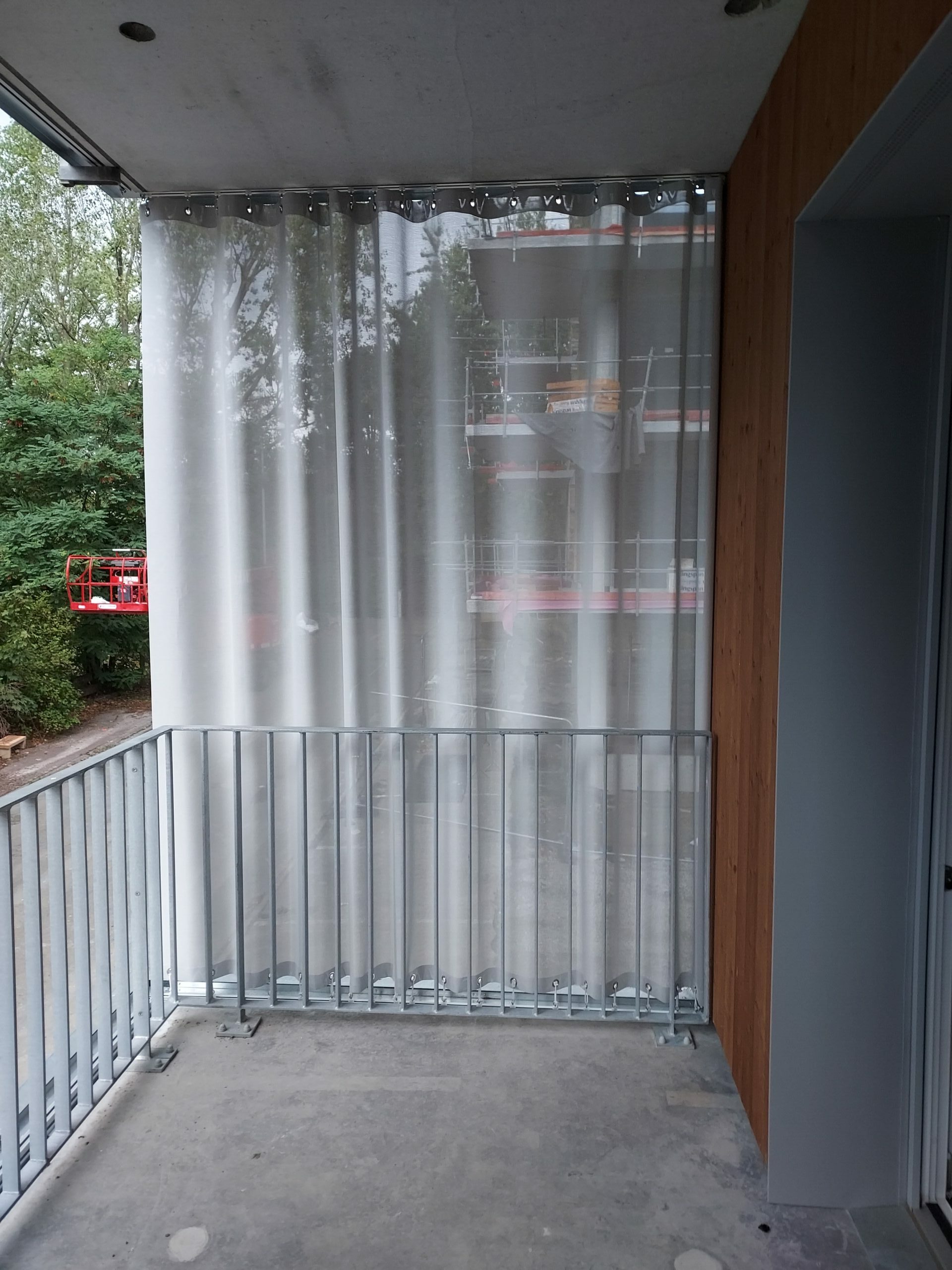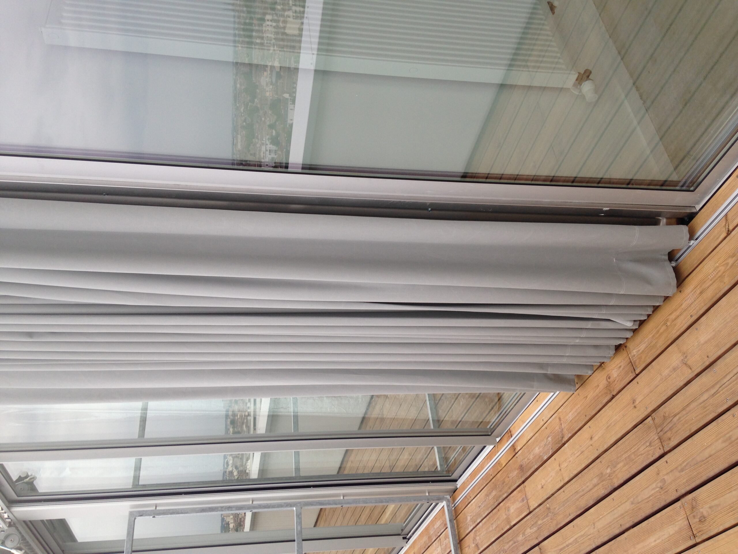 Rideau de protection solaire extérieur, classement de résistance au feu M2, avec un facteur d’ouverture de 15%.